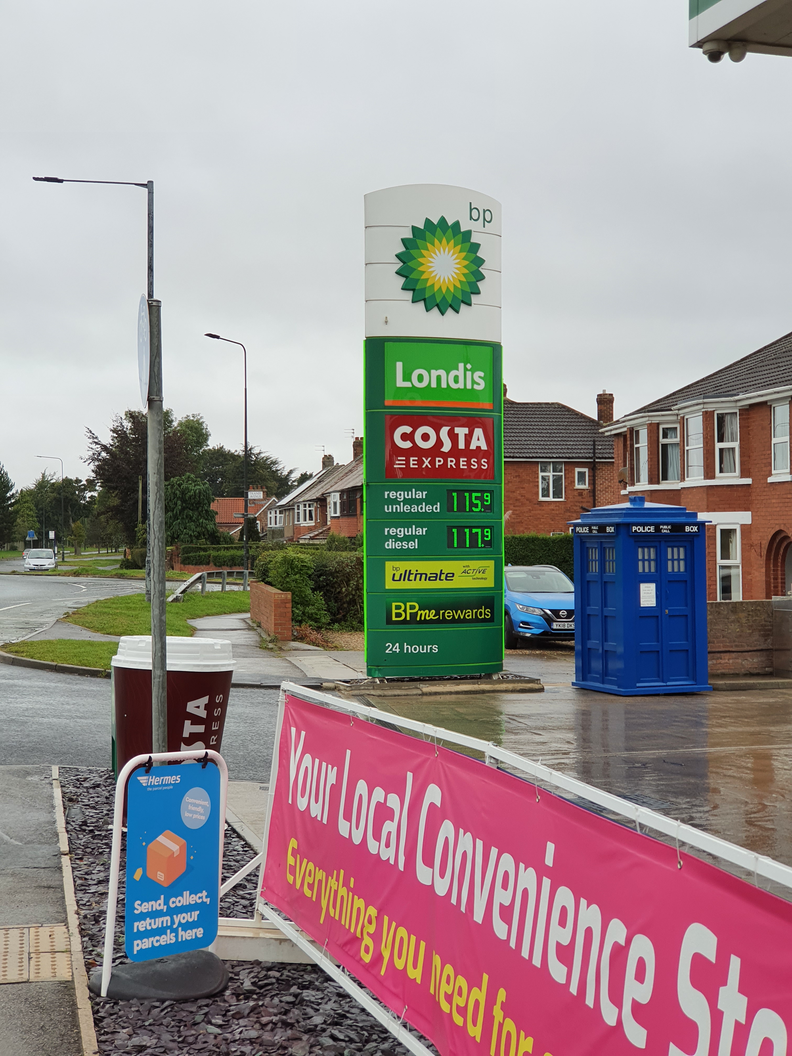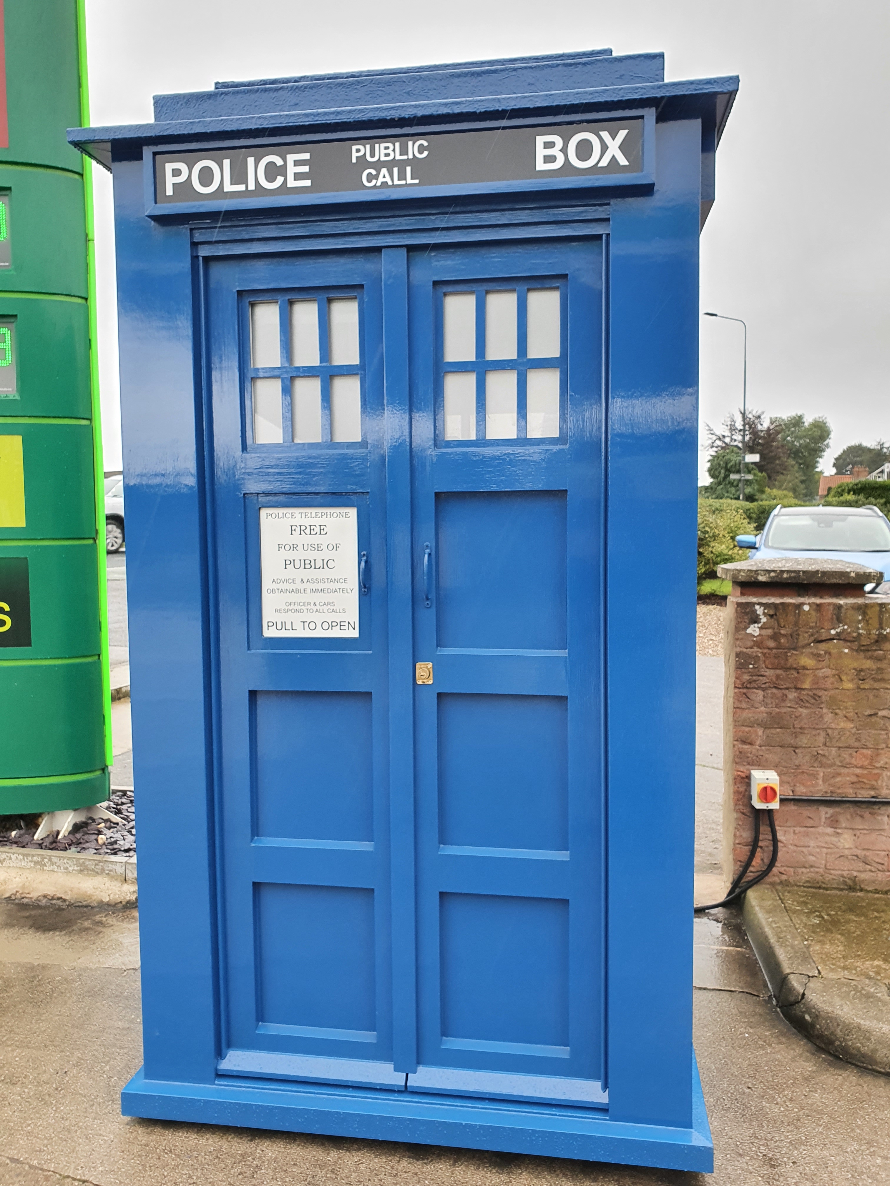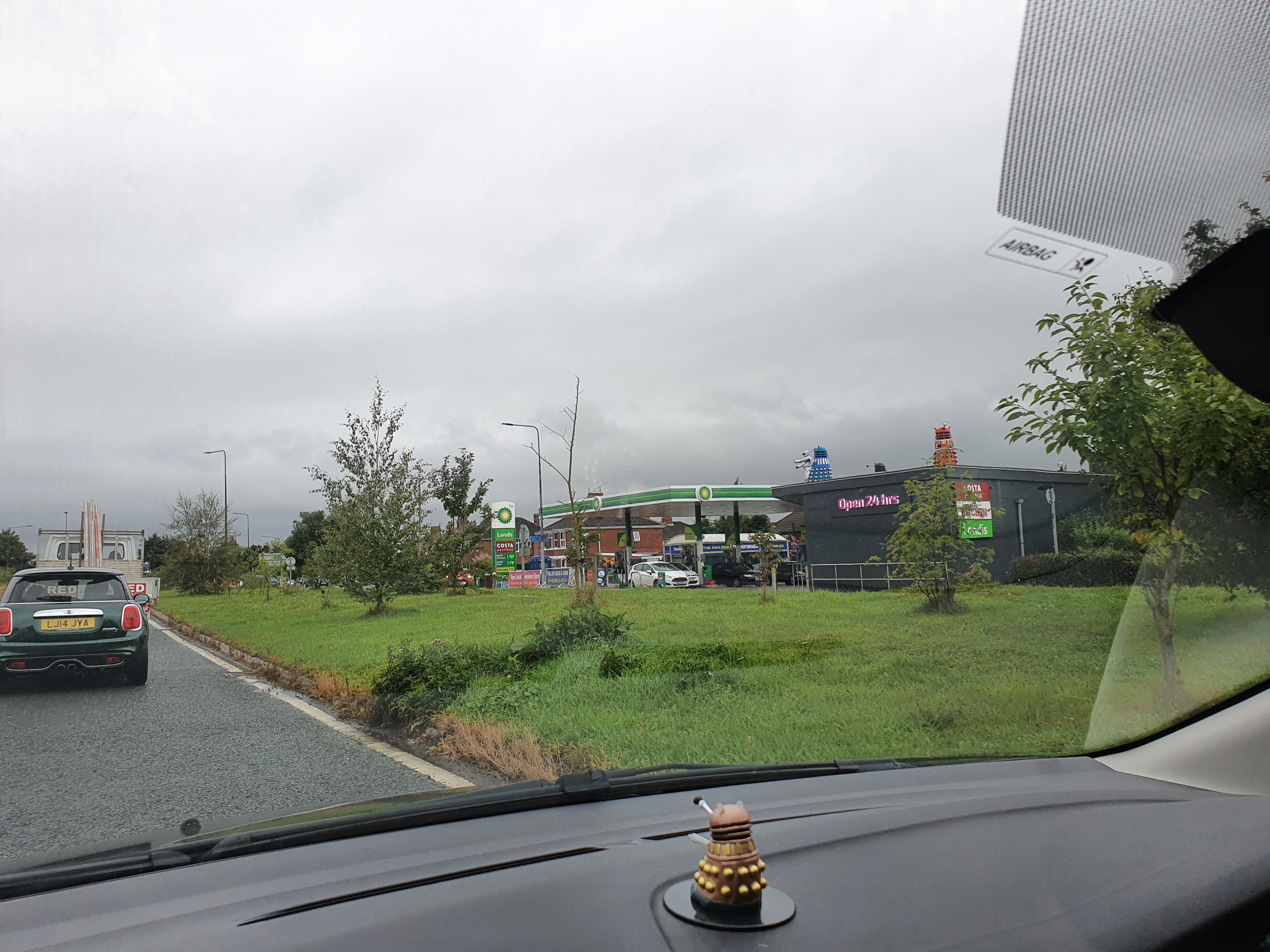 With much anticipation we came off the motorway and approached the service station, indeed there was not one, not two, but three Daleks! A Cyberman too and to our delight a full-size TARDIS. As we didn’t need any fuel, we parked up at the B&Q next door and giddier that two grown adults should be practically skipped over to the forecourt.