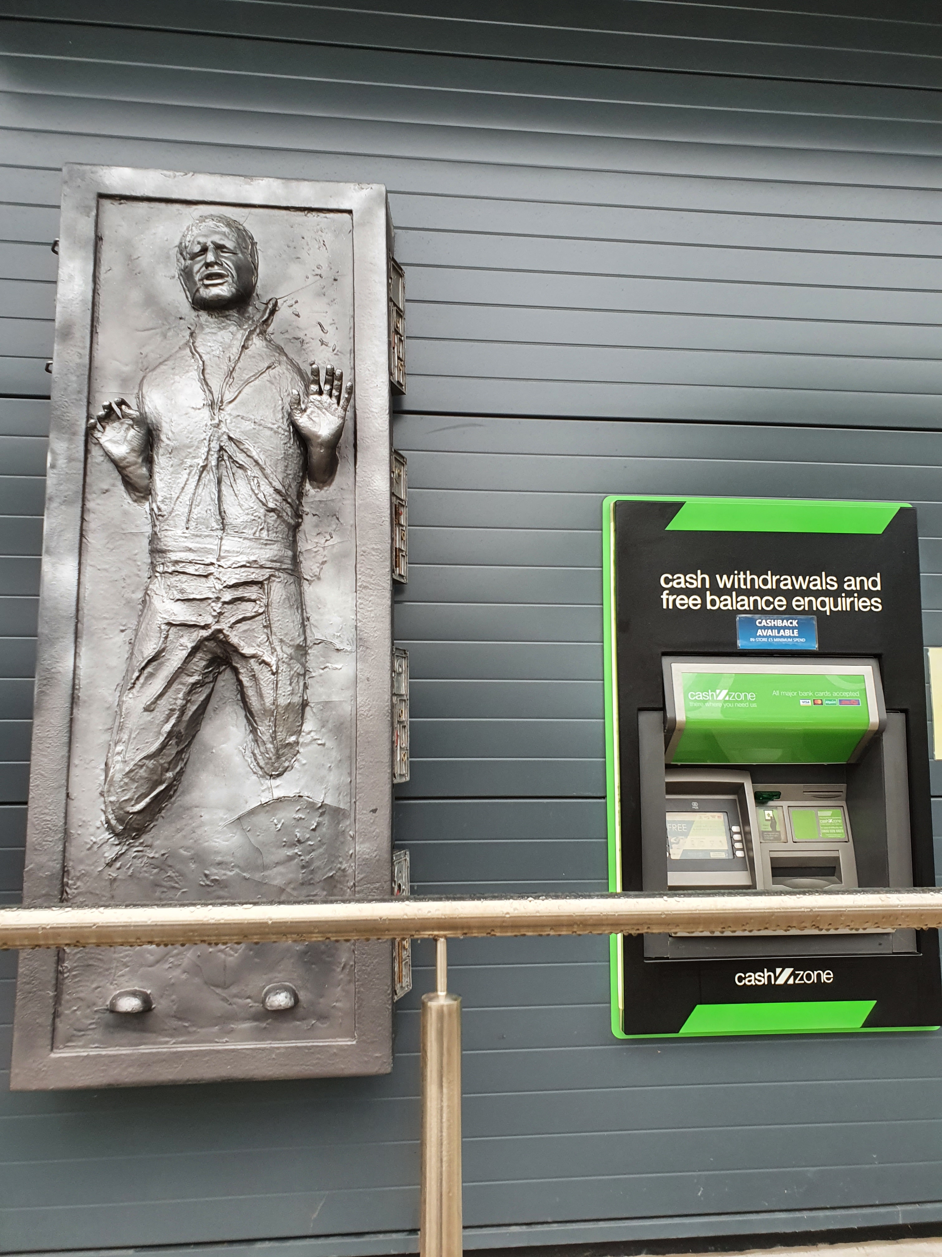 Now I’d have been more than happy with the Doctor Who stuff – but it got better. There’s a Transformers car wash, with two very large Autobots. By the cashpoint is a Han Solo in carbonite watched over by Boba Fett on the roof above. Finally, the entrance to the shop is guarded by a lone Stormtrooper. After taking far too many photos and the obligatory TARDIS selfie we did finally pop into the shop to buy some bits for lunch.