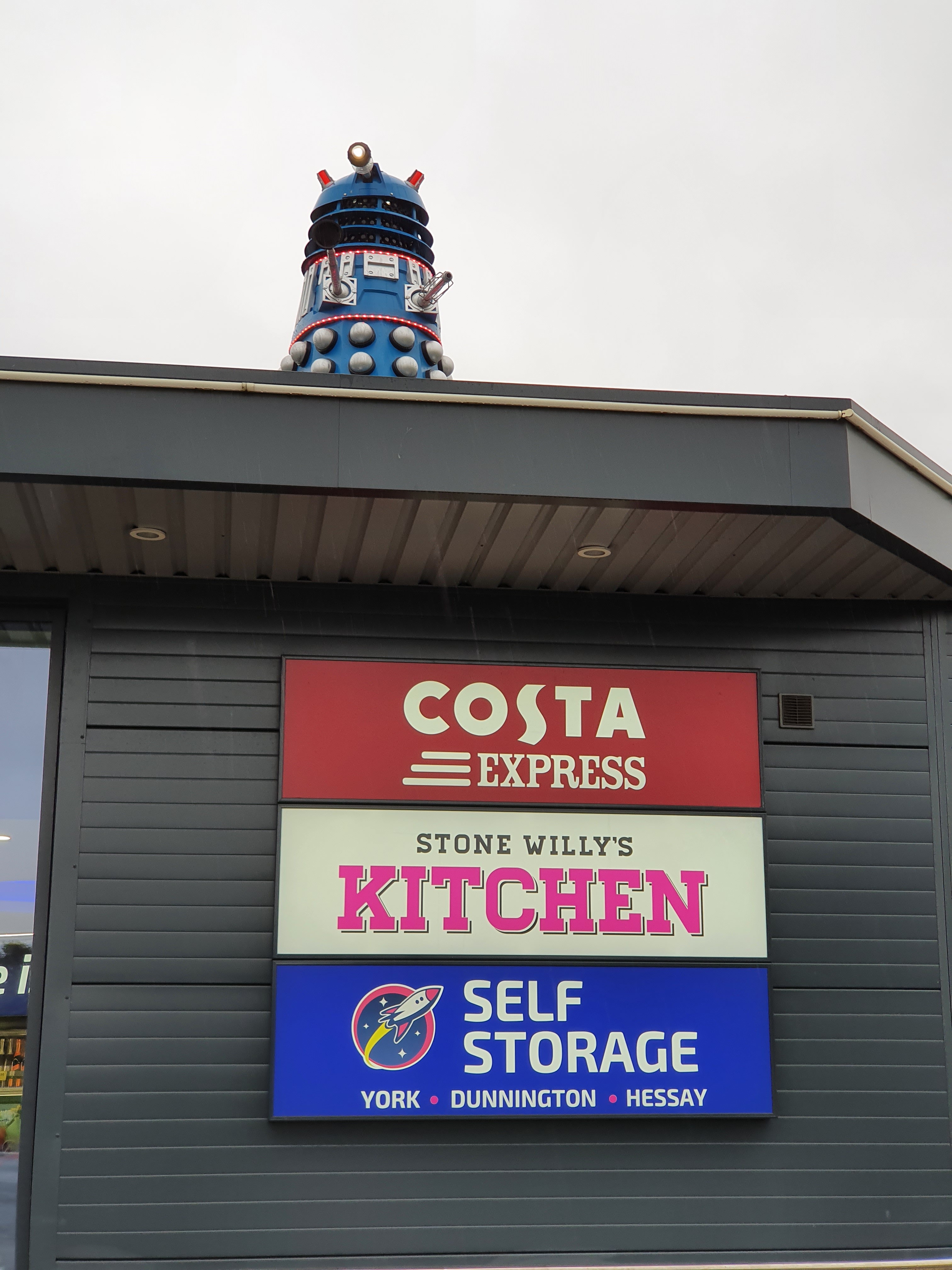 Heading over to the east coast last month for a few nights break, my husband remembered that he’d seen pictures of a service station somewhere near York with a geeky twist – Daleks! As he was driving, I was able to quickly google “sci-fi petrol station York” and up popped the ‘Inner Space Stations Service Station‘. From the pictures I knew it was the place and best of all it was en-route to Scarborough and only a five minute detour!