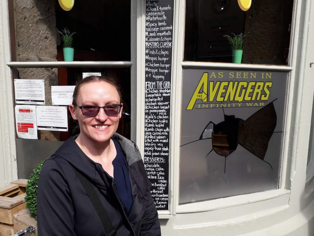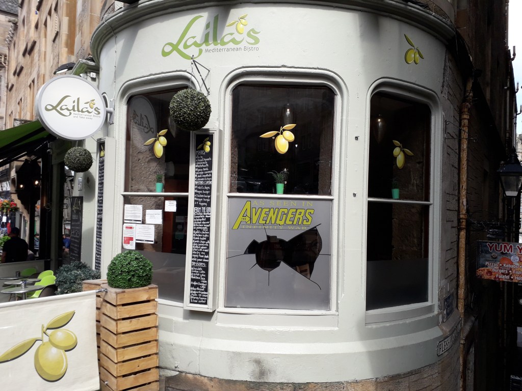 When I visited the Scottish capital in 2019 I’d forgotten that Wanda & Vision hide out in Edinburgh at the start of ‘Avengers – Infinity War’. Fortunately, one of the café’s on Cockburn Street in the Old Town has a very prominent sign in the window which proudly advertised the fact that it was used in the film. Of course, it’s a perfect photo opportunity for the film location geek.