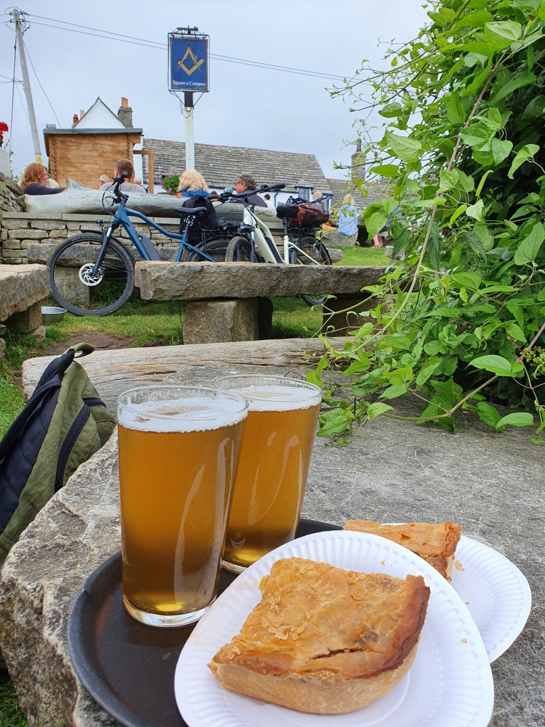 We discovered a slightly less treacherous path back up to Worth Maltravers and indeed had that much-deserved pie and pint – I highly recommend Hattie Brown’s Osiris beer and the cheese and potato pie. Just as we were about to enjoy some live music outside the heavens opened – a true British summers day!
