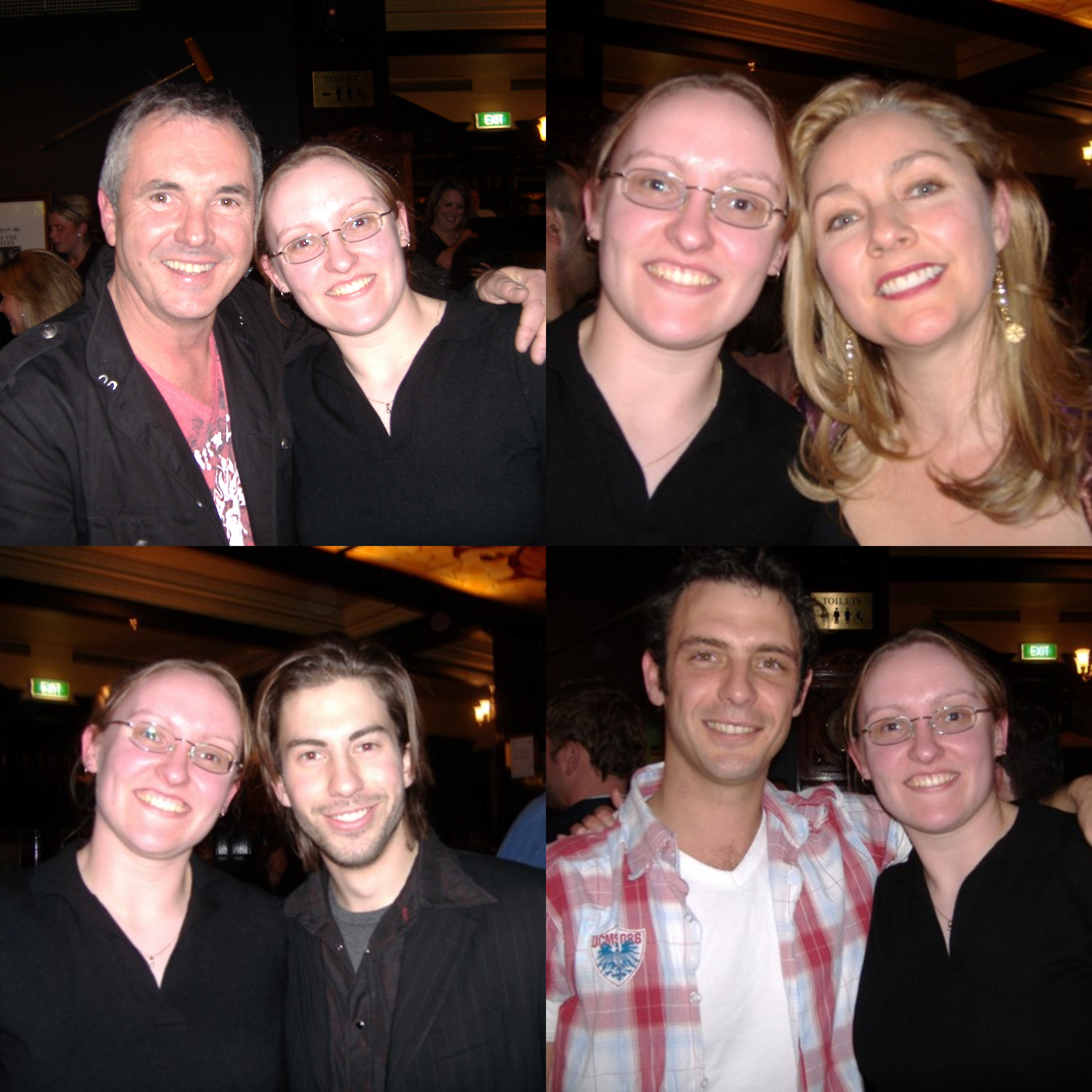 While everything was going on, true to their word, the actors came round, all where very nice. I reminded ‘Dylan’ we’d met last week and posed for another photo. To give the man credit, when asked at the beginning if he’d any plans of having a pop career he firmly said ‘no’ then proceeded to give a version of his character as a member of a boy band – which was very funny. I even got a peck on the cheek from Dr Karl, boy was he popular – and loving every minute. In this room the man was worshiped as a god! Two of the lads on our table got rather excitable and one had his t-shirt signed (he brought the pen especially) and his mate got his stomach signed – I think he surprised himself with that!