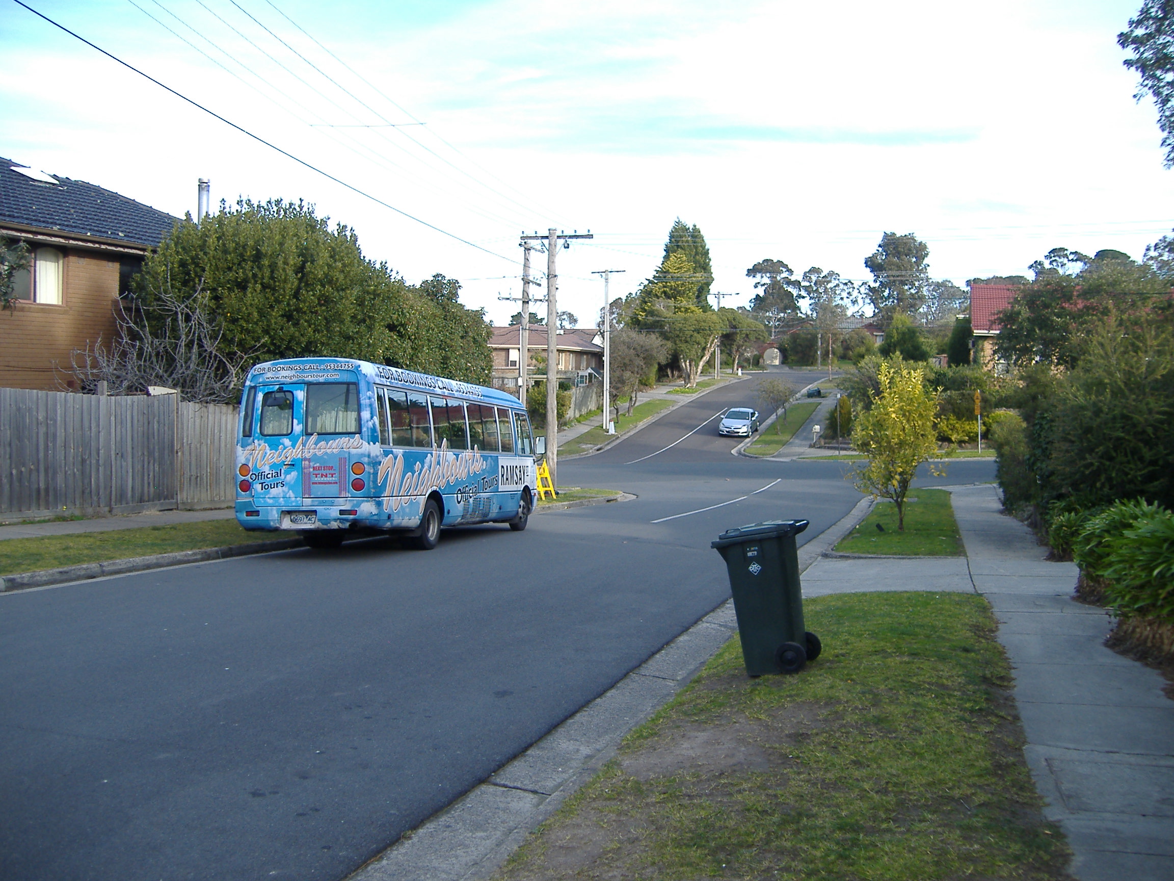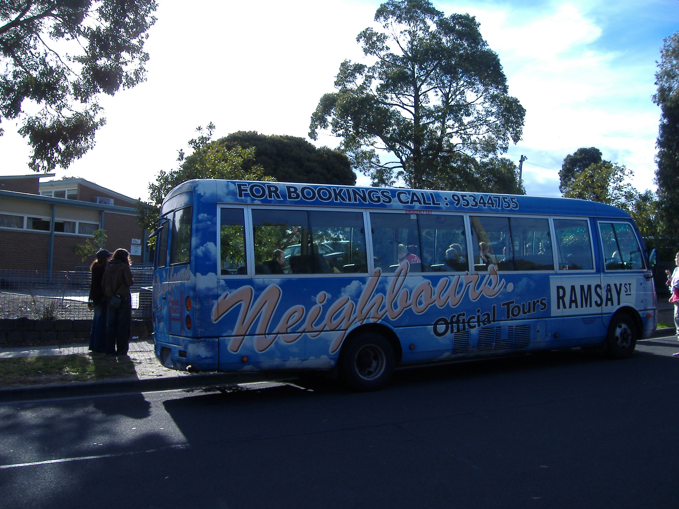 As I’m visiting Melbourne, home of the studios and locations, it was only proper of me to do on official “Neighbours Tour”. For $40 I joined a bus full of fellow fans (mostly English, a couple of Welsh / Irish and some Australians). The bus was decked out in less than subtle livery. Our guide – a self-proclaimed genuine ‘Aussie Shelia’ with a genuine enthusiasm for the show (but not of Melbourne suburbs!) was great.