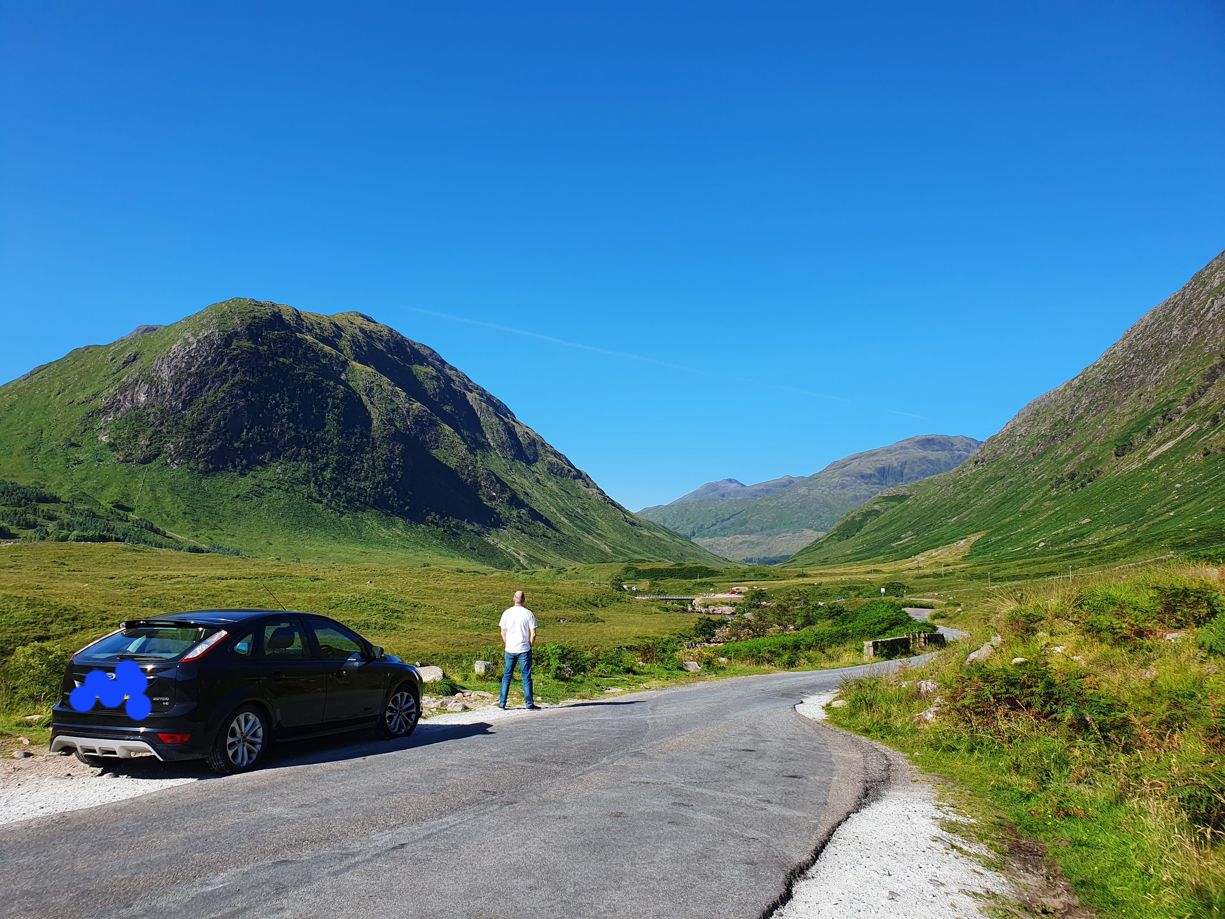 The actual road itself is just off the A82, the main road through the Glen, not at all remote really. The only downside was it was peak summer holiday season and a single-track road! As we drove, we passed lots of people slowly starting the day after either sleeping in their campervans or even in tents in the glen. Our fear that we would find the spot and not be able to park disappeared when we turned a corner and saw that it was empty! With the music playing we pulled up and enjoyed our moment of achievement. We then had a silly 5 minutes taking the obligatory photos with us posing as Bond by his car, in our case a Ford Focus rather than an Aston Martin but as you’ve probably gathered from this blog, we have a healthy imagination! We weren’t alone for long, as we soon heard the Bond theme playing from a car that slowly pulled up behind us, more 007 fans! With a smile we got back in the car to head off and let them have their own geeky moment.