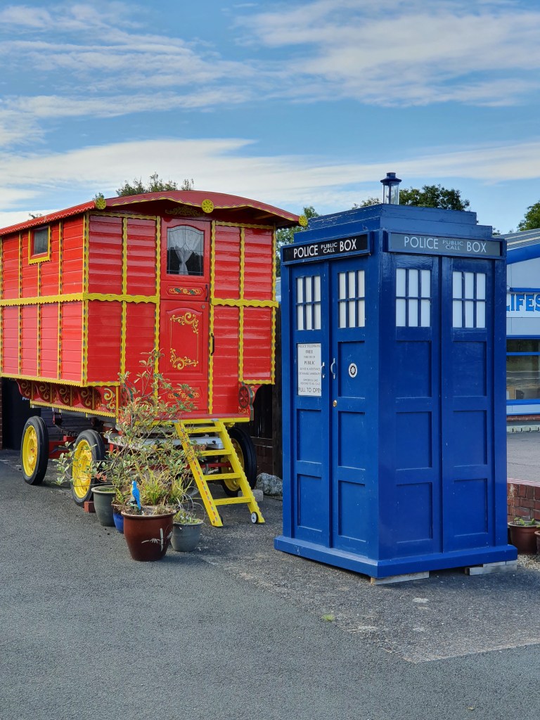 Knowing my love of a certain big blue box a friend mentioned they’d driven past a TARDIS, not far from where we stayed over for the party. On our way to Powis Castle we made a slight detour through the small town of Newtown and true enough, there on the outskirts was a beautiful blue police box. It was paired with a lovely Gypsy caravan and we hope that the owners didn’t mind two random people stopping by and appreciating their very nice garden décor.