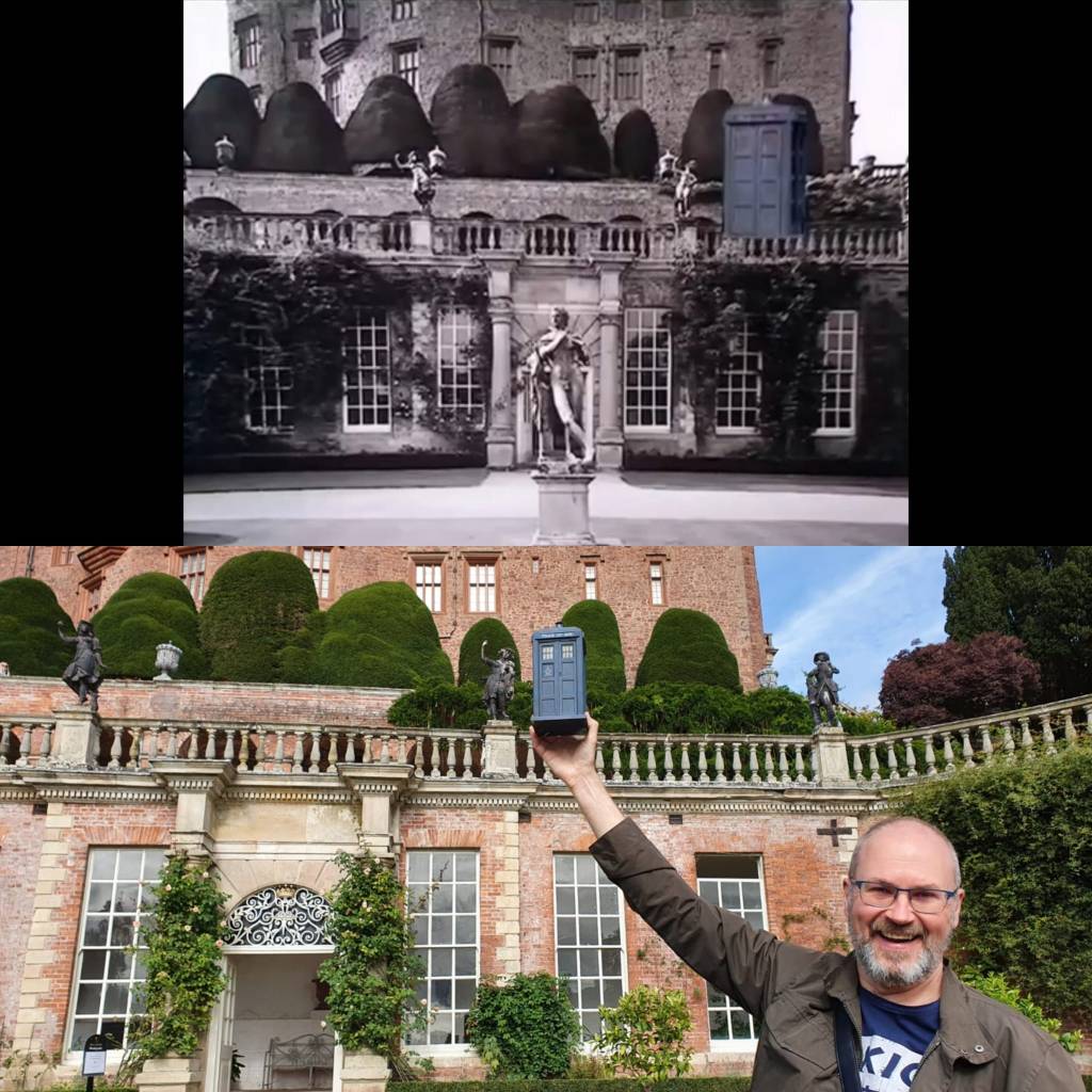 Doctor Who used Powis Castle as a background for part of another universe – ‘E-Space’. So the slightly dodgy effects almost play into the alien environment… almost. The story ends with the departure of the 4th Doctor’s companions Romana and K-9 when they choose to remain in E-Space. I deliberately wore a red coat so I could match Lalla Ward’s outfit in the story as she walks away. My husband brought along a toy TARDIS, a travel essential for us, we managed to take a few pictures of Andy and TARDIS matching up with screengrabs as best we could.