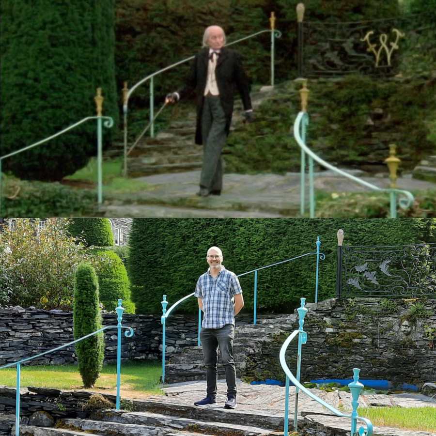 The next scene location we wanted to track down was one where the First Doctor is whisked away by the ‘time scoop’. We found this on the main lawn by matching the hedges in the background. In the middle of the lawn there is a handsome tree with seating below it and we came across the first people we’d seen that morning sat beneath it. As I directed Andy to stand in the right spot to take his picture we were approached by one of group who kindly offered to take a picture of both of us together. I started to explain what we were trying to recreate and he replied “Oh, I know exactly what you’re doing, I’ve come here for the same reason.” A fellow geek!