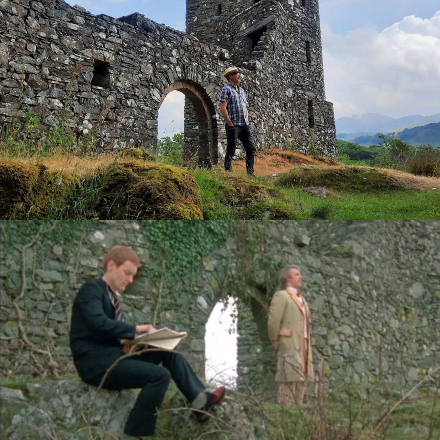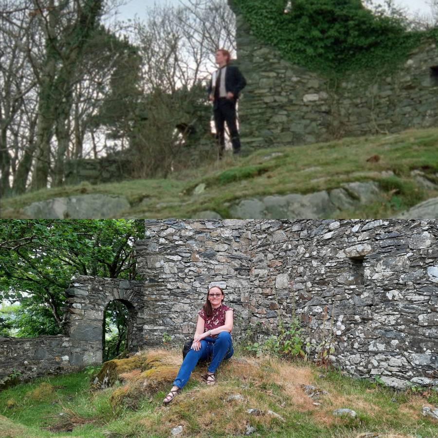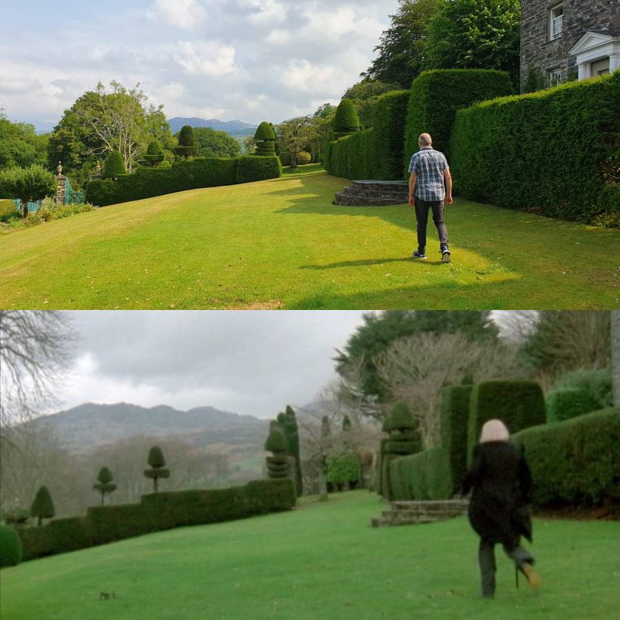 We wandered a bit more, just taking in the pleasantness of the morning. We took seats outside the cafe and enjoyed a pot of tea with some delicious traditional Welsh bara brith as slowly a few more people arrived at the gardens. We identified another scene that had been shot just by where we were seated, some statutes had moved and a patio extended but a distinctive small pond remained.