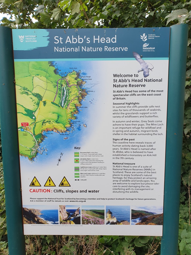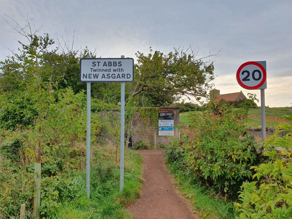 As the weather was staying dry, we decided to go for a walk along part of the St Abb’s Head coastal path. From the tourist information centre video we realised that the road featured in ‘Engame’ with the actual ‘New Asgard’ sign was potentially walking distance away. In the film they cheat with the geography a little as the road shown is just north of St Abbs and not the actual road down to the village. A useful map at the National Trust centre gave a few different walks to follow and we worked out that we could get there without it being too arduous. Even if we failed it would still be a pretty walk.