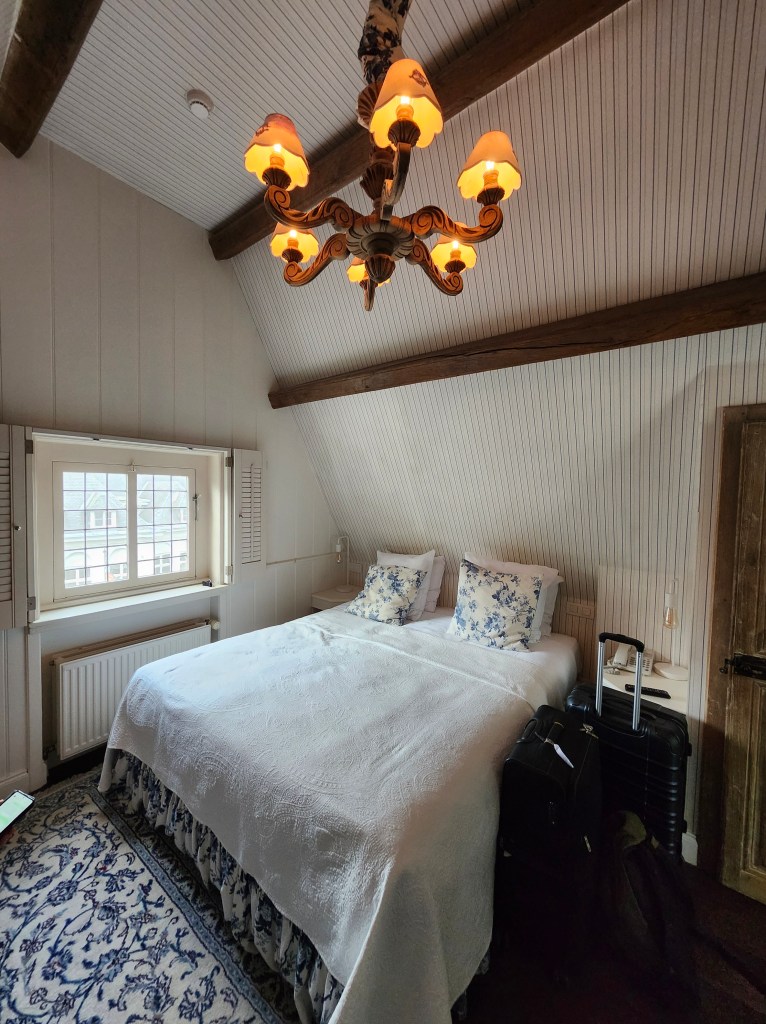 The hotel appears throughout the film, and in 2024 is easily recognisable, a little posher perhaps than it appeared back in 2008. I’d been able to book the cheapest, smallest room they had which turned out to be more than adequate. The receptionist was very nice as he gave us the key to “ah, yes, the charming room” (I took that as code for cheap!). I was pleasantly surprised there were elevators in the old 16th century building and it took us up to the 3rd floor – they’re so small though the receptionist had to take the stairs to meet us at the door to the room!