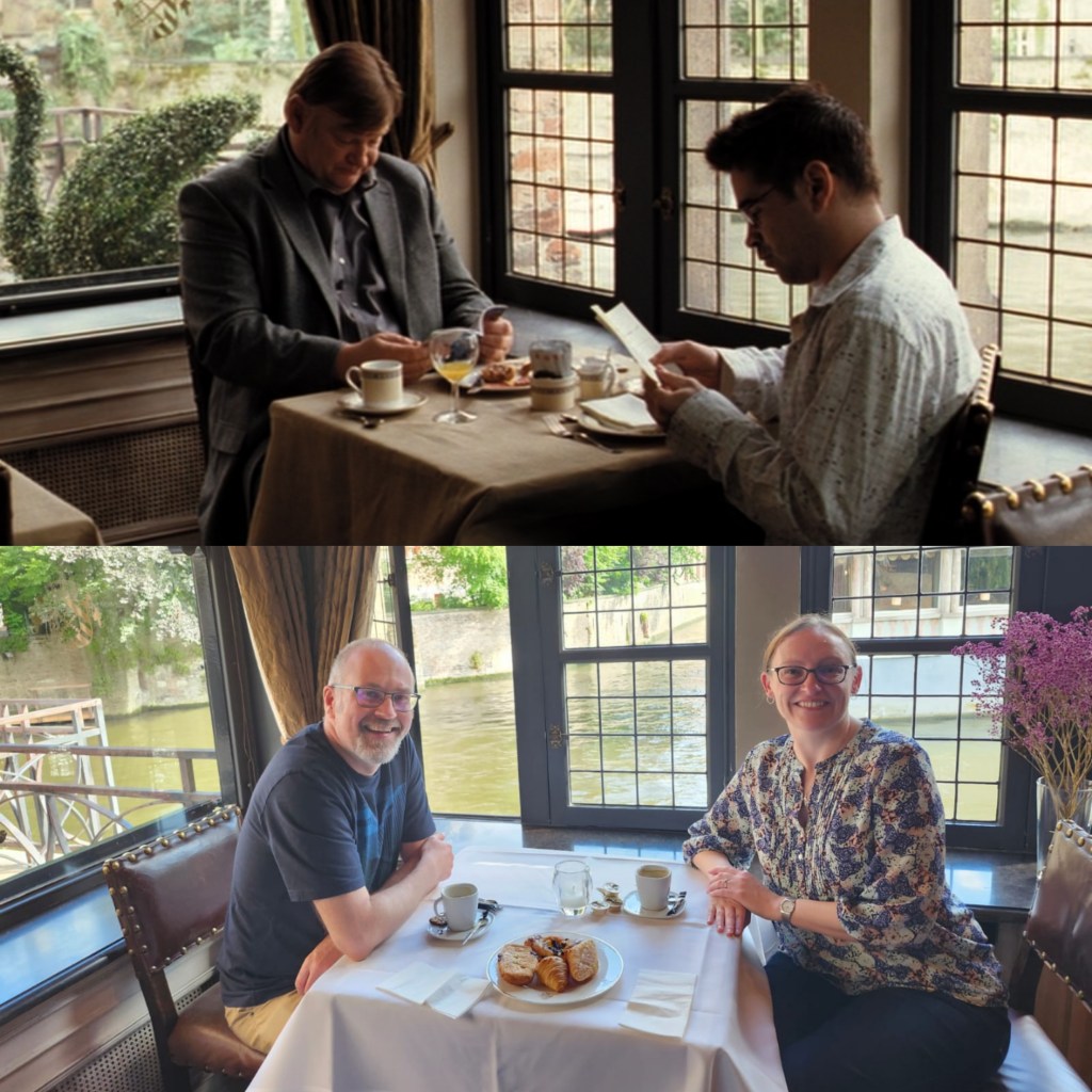 On our last day we had a late flight, so when we checked out of the hotel we asked to leave our bags at reception, then we were going to grab some breakfast elsewhere. The lady at reception, who I think might have been the manager, asked if we’d like a coffee before we left. We took the opportunity to have one final sit at ‘that’ table. We were offered the remaining pastries from breakfast too, which was a bonus! I asked the manager if she could take our picture at the table. She mentioned it featured in ‘In Bruges’ and we told her it was one of the reasons for our trip. Before we left I flicked through the visitor’s book and saw a few past guests had commented about the film too. It was reassuring to know we weren’t the only ones!