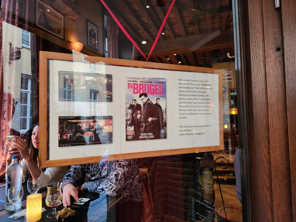 “Restaurant Diligence was a film location for the movie ‘In Bruges’, the blockbuster from 2008 with top actors Colin Farrell, Brendan Gleeson and Ralph Fiennes. The famous scene with the prostitute and the dwarf was filmed here. Please feel free to have a drink at the bar in the seat where Colin Farrell and Bredan Gleeson were seated!”