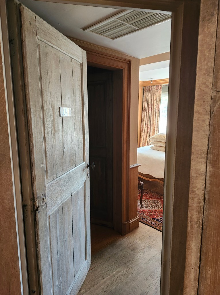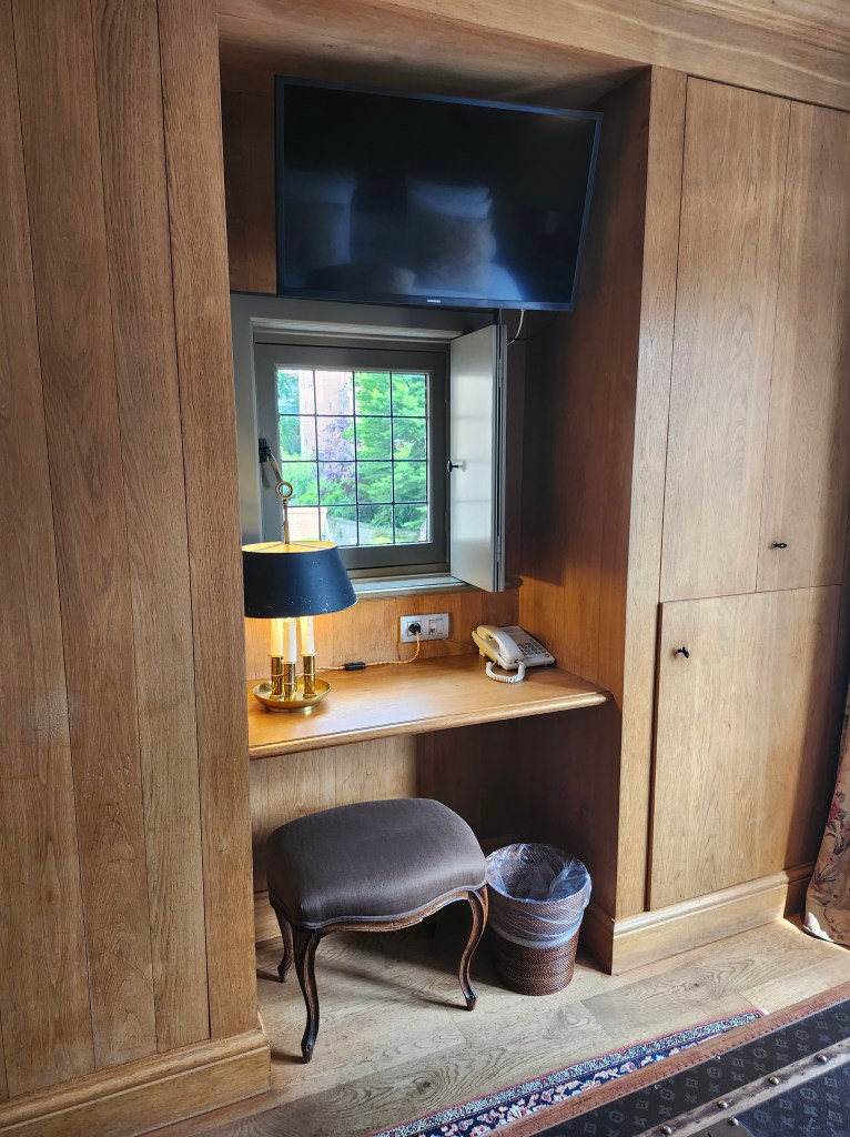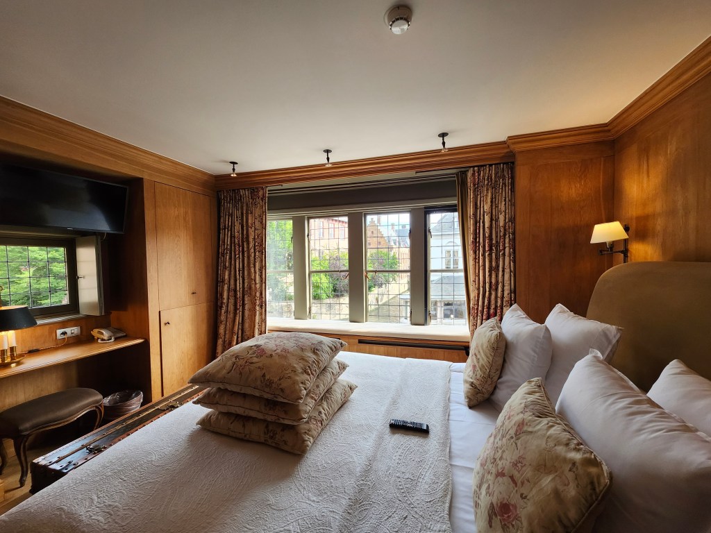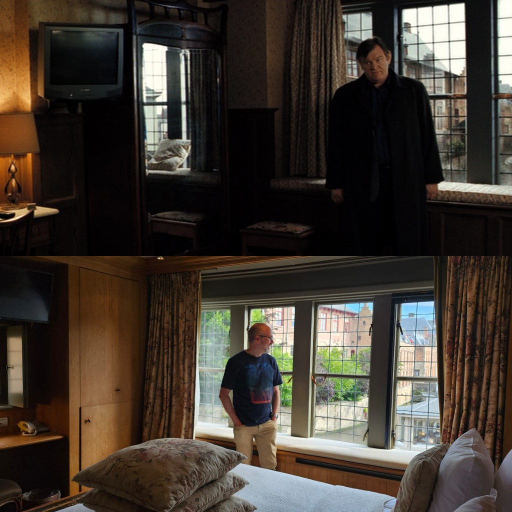 As I was wrote a few lines in the book myself I could see the manager checking something at the reception desk. She then casually asked if we’d like to see the actual bedroom used in the film. Of course we jumped at the chance! Andy had suspected the hotel room scenes had been filmed on a set, like the belfry tower, but no – they had indeed been filmed in a large room on the 1st floor. The room had changed significantly since filming. It was much more upmarket, with a massive luxurious bed. I would suspect it’s probably the most expensive room in the hotel.