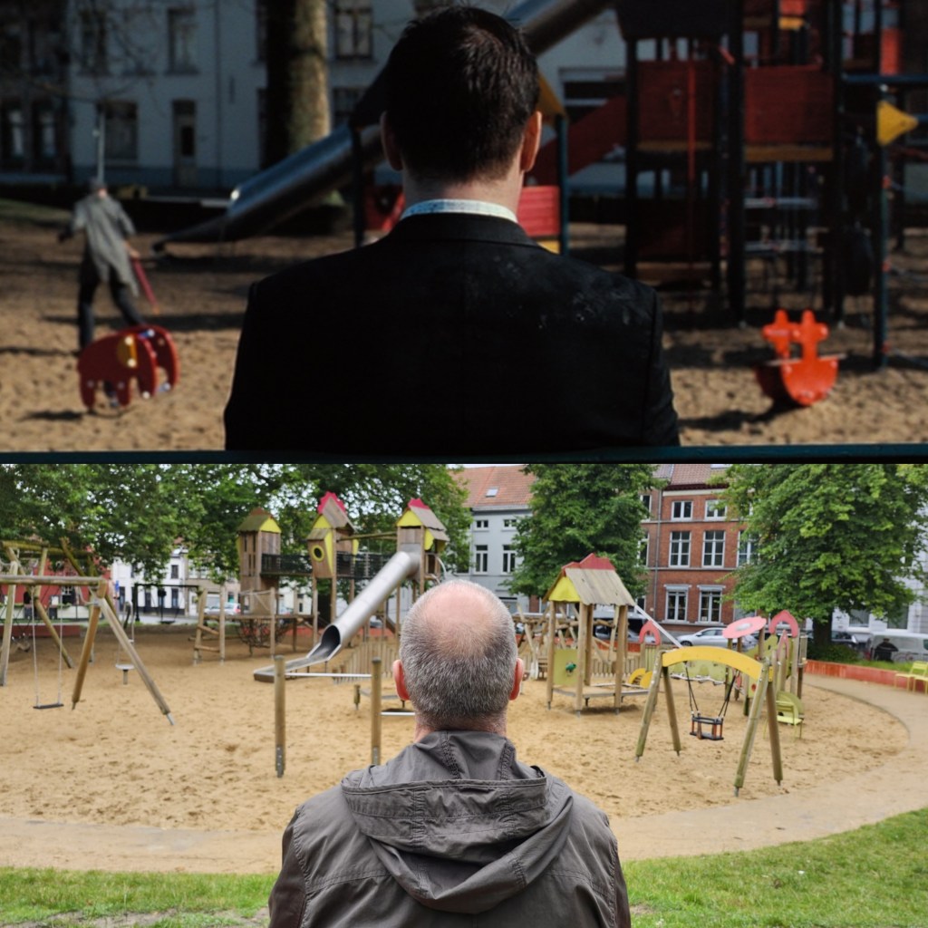 The bench scene at Jan Van Eyckplein with the Jan Van Eyck statue behind – there is no bench, it was a prop.