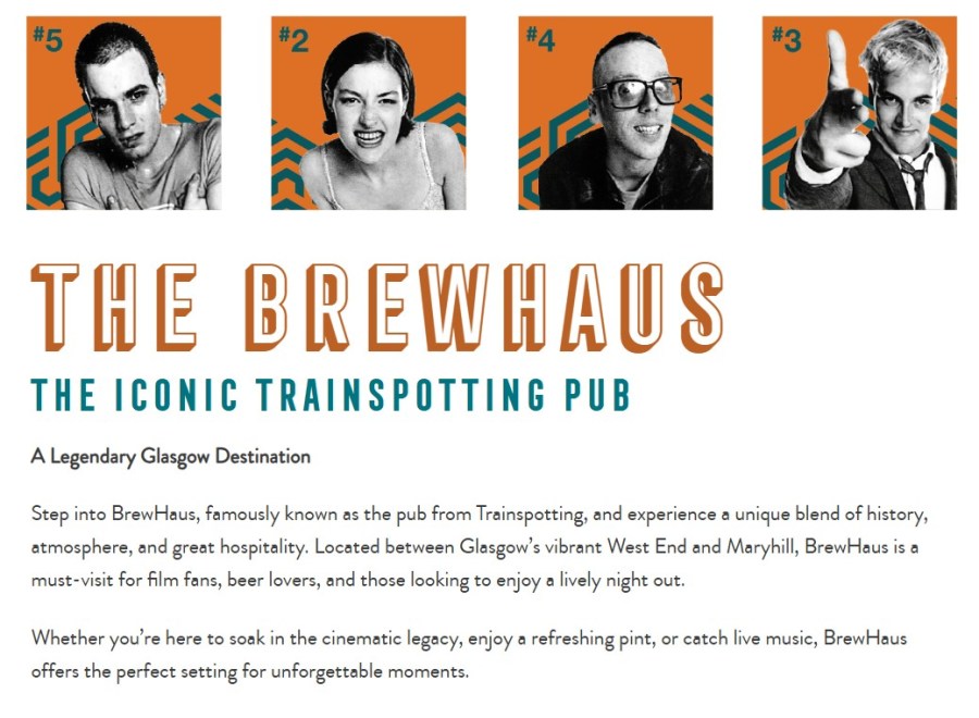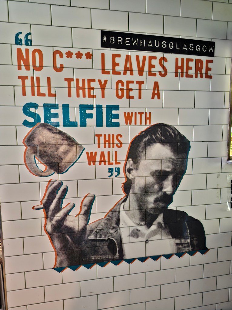 Now called the ‘Brewhaus‘ I’m pleased to report that it’s thoroughly embraced its small part of cinema and has artwork inspired by the film decorating the bar. It’s prominent in their marketing too – the first thing you see on their website is the statement ‘ The Brewhaus – The iconic Trainspotting Pub’ and goes on to say “Made famous by Danny Boyle’s cult classic Trainspotting, Brewhaus is a true Glasgow landmark. Fans of the film can step inside and experience a piece of movie history while enjoying our top-quality drinks and entertainment.” It’s a pub that’s just a bit too out of the way for general tourists to stumble across, we only went because of the filming connection, so hopefully this brings in more trade.