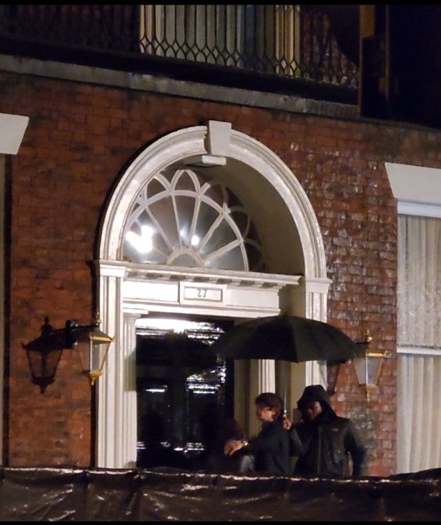 Actual filming seemed to be taking place in the doorway closest to the crowd. If you were tall enough and stepped back you could see two actors in position. One figure looked like a 1960s era Beatle with the trademark mop of dark hair. Of the four lead actors this was easily identifiable as Barry Keoghan playing Ringo Starr. He was with a woman (presumably playing Ringo’s girlfriend, possibly Mia McKenna-Bruce) and they were both being sheltered from the artificial rain by a man with a large umbrella. Barry seemed to fluff his hair several times before shooting, and at one point appeared to acknowledge the observers with Ringo’s trademark ‘Peace & Love’ sign. There was no camera that I could see, so I think it may have been positioned inside the building filming them entering.